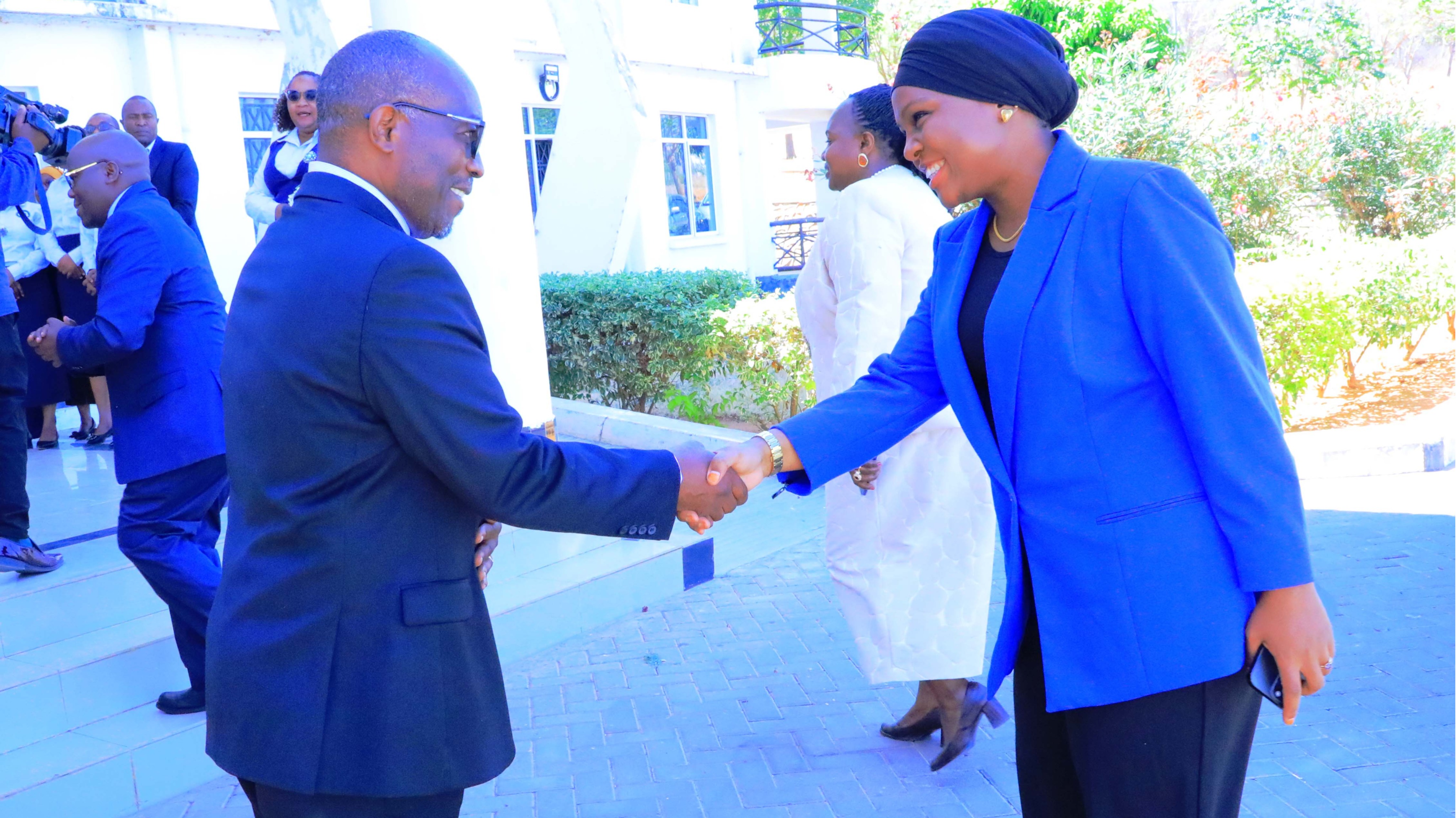 Katibu Mtendaji Tume ya Kurekebisha Sheria Tanzania Bw. George Mandepo akisalimiana na Naibu Waziri Katiba na Sheria Mhe. Zainab Athman Katimba walipotembelea Ofisi za Tume hiyo leo tarehe 26/11/2025