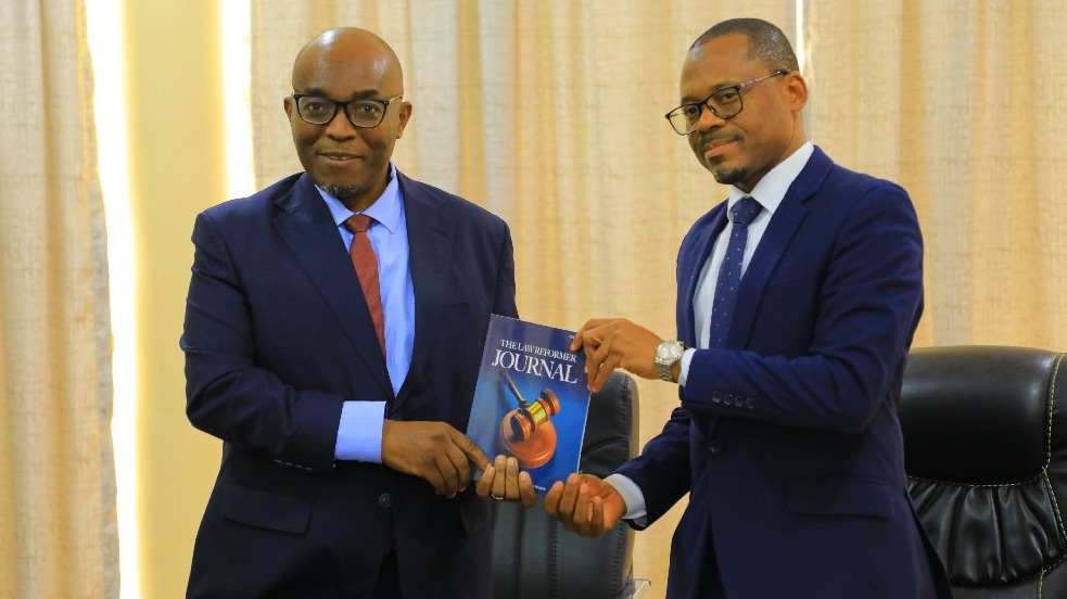 Katibu Mtendaji Tume ya Kurekebisha Sheria Tanzania Bw. George Mandepo (Kushoto) akimkabidhi Jarida la The law Reformer Journal Bw. Shaaban Abdalla baada ya kumaliza kikao cha mapitio ya Mkataba wa Makubaliano ya Ushirikiano (MoU) baina yao kilichofanyika tarehe 25/09/2025 katika ukumbi wa mikutano wa Ofisi ya Mwanasheria Mkuu Zanzibar.